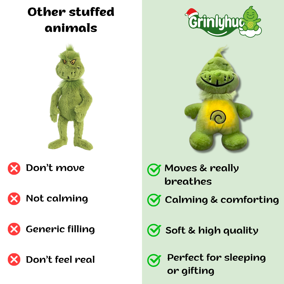 Unlike ordinary stuffed animals that just sit still, GrinlyHug™ gently moves and really “breathes”, feels soft and high quality, and brings calming comfort that’s perfect for sleeping or gifting.